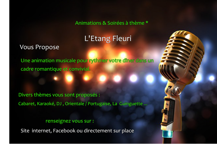 Votre Restaurant L'Etang Fleuri organise des SOIREES MUSICALES avec dîner , dimanches GUINGUETTE avec animation musicale et piste de danse en été et des soirées PIANO-BAR à partir de novembre 2025 .